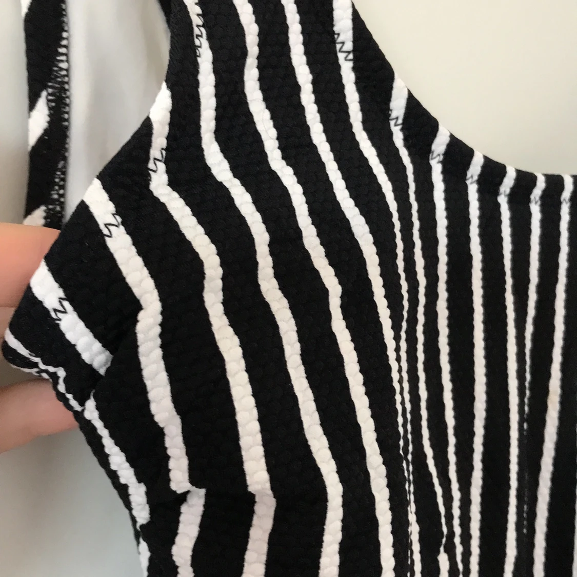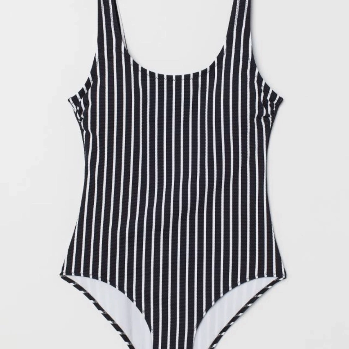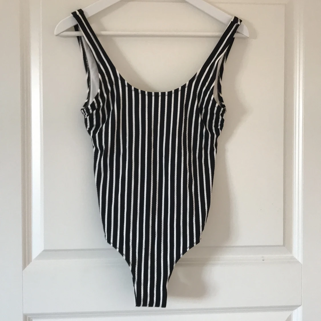 Svart/vit randig helfodrad baddräkt från H&M. Har vadderade kupor och djupt ringad rygg. Tyget är strukturmönstrat. Använd ett fåtal gånger☀️🐠