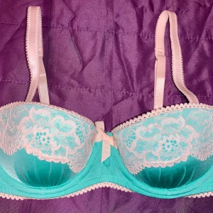 Jättefin mintgrön/turkos BH med vita spetsdetaljer. Från H&M i storlek 70A. Använd enstaka gånger, i mycket gott skick utan defekter. ☺️