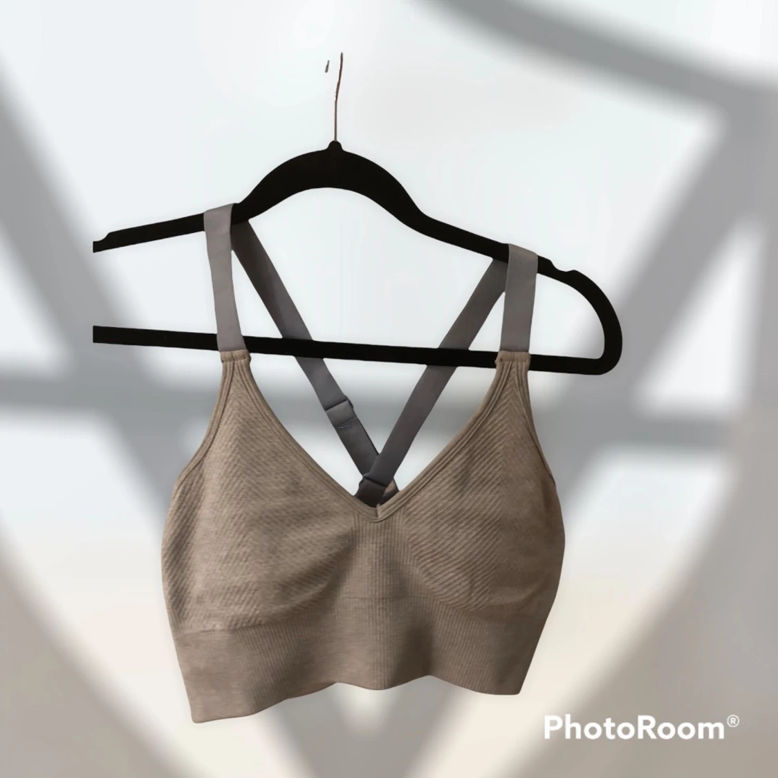 Super bekväm och fin tränings bh! Grå ribbad med babyblåa band. Inlägg saknas. Använd men i fint skick.