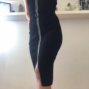 Svart set med matchande dragkedja på både kjol och top. Liten slits på kjolen. Stl. S i kjol och XS i top.
