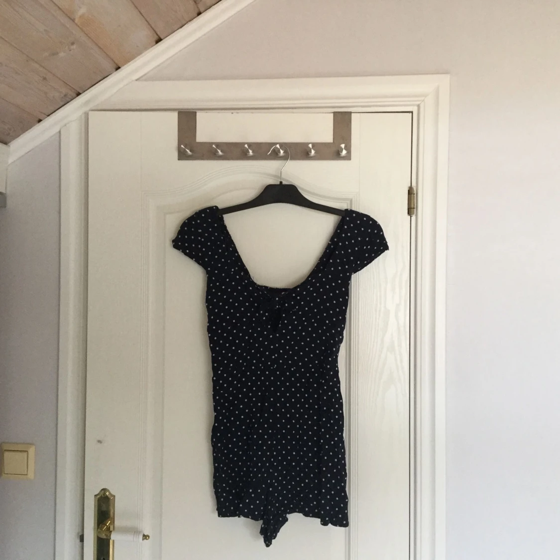 Ny mörkblå jumpsuit med vita prickar. En roset över bysten som är fast sydd (se bild 1). Jumpsuiten är mycket kort i modellen jag har storlek 38 i vanliga fall och denna jumpsuiten är storlek 40 och den är för liten för mig. Inköpt i somras aldrig använd.