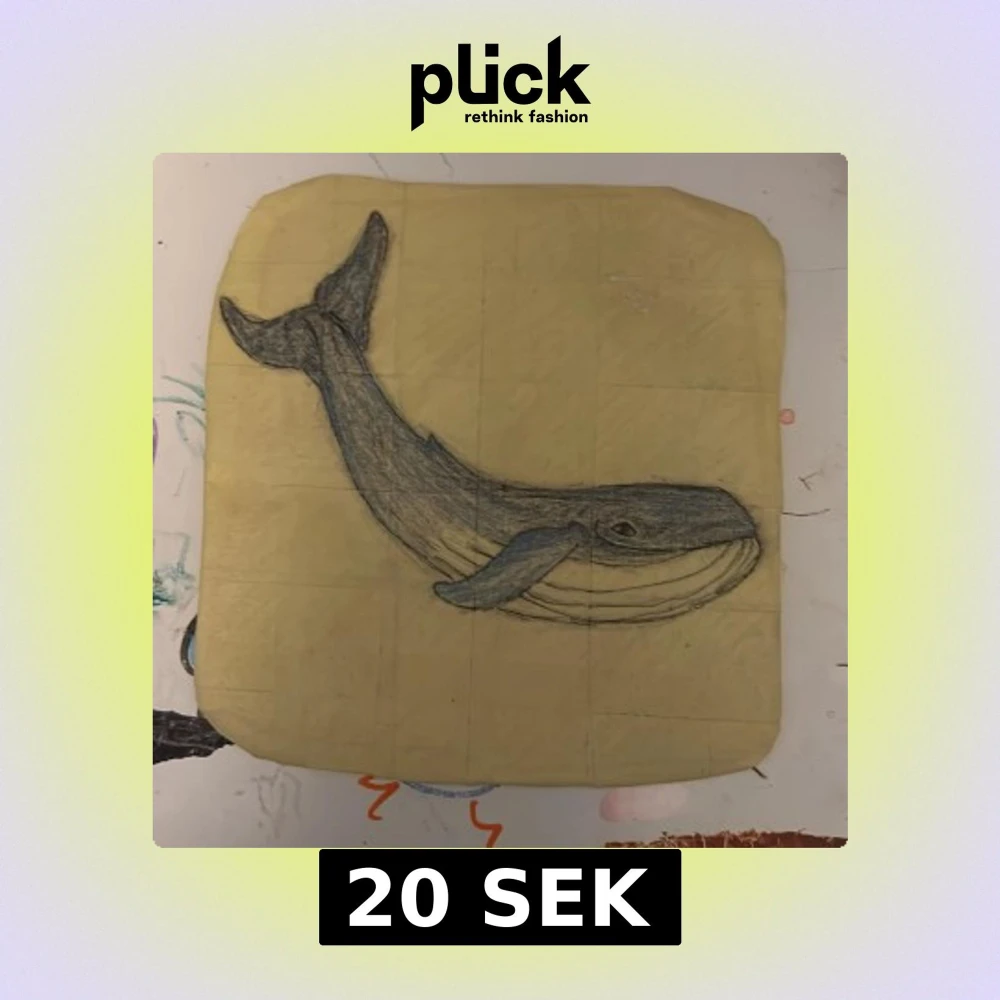 Handgjord teckning av en val på maskeringstejps bakgrund. Teckningen är gjord med blyerts och har detaljerade linjer som framhäver valens form och rörelse. Perfekt för att dekorera ditt rum eller vad du vill.