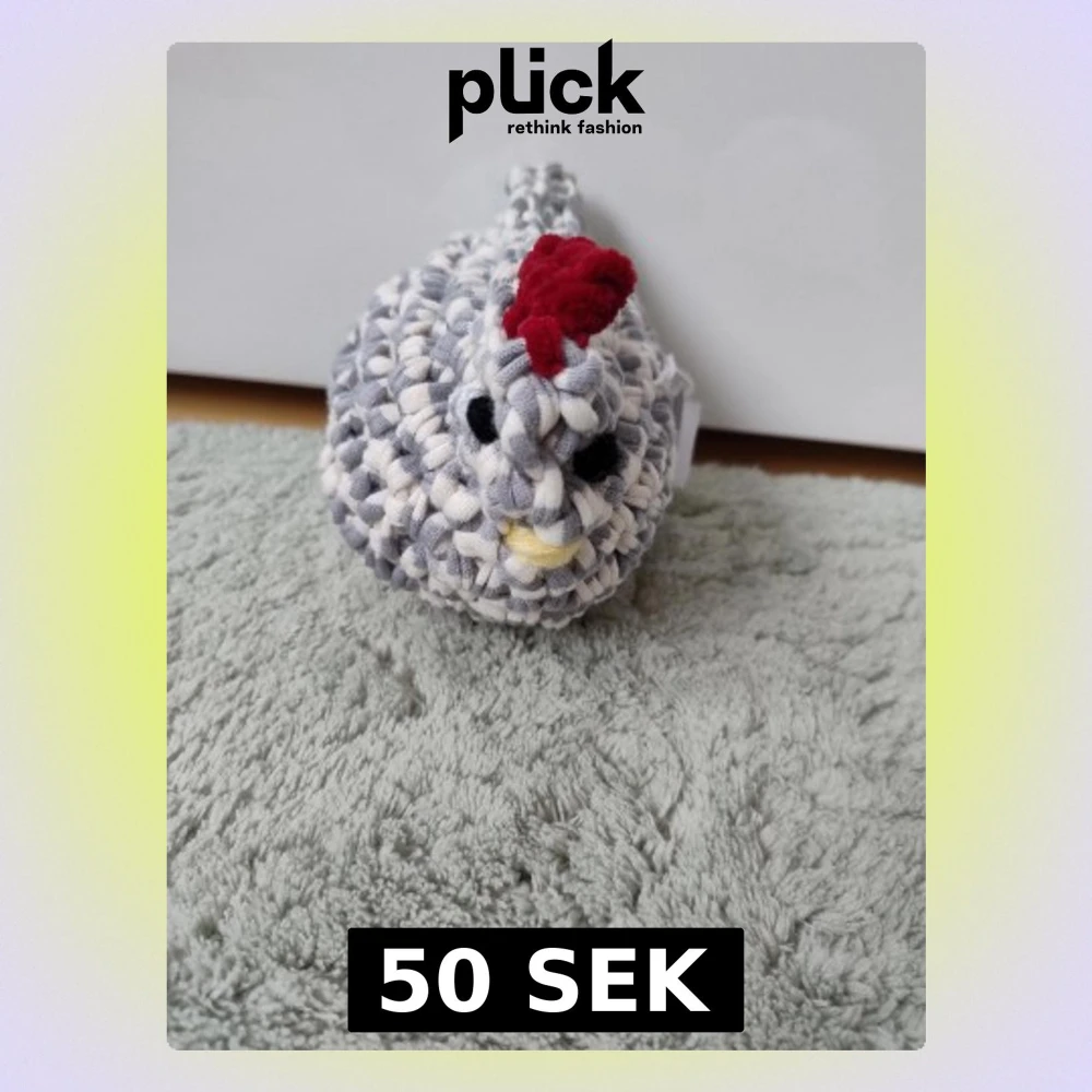 Handgjort virkat gosedjur i form av en höna. Hönan är virkat i ett tjockt garn som är grått och vitt och fylld med mjuk vadd. Den har även en tuppkam i ett mjukt rött och fluffigt garn.