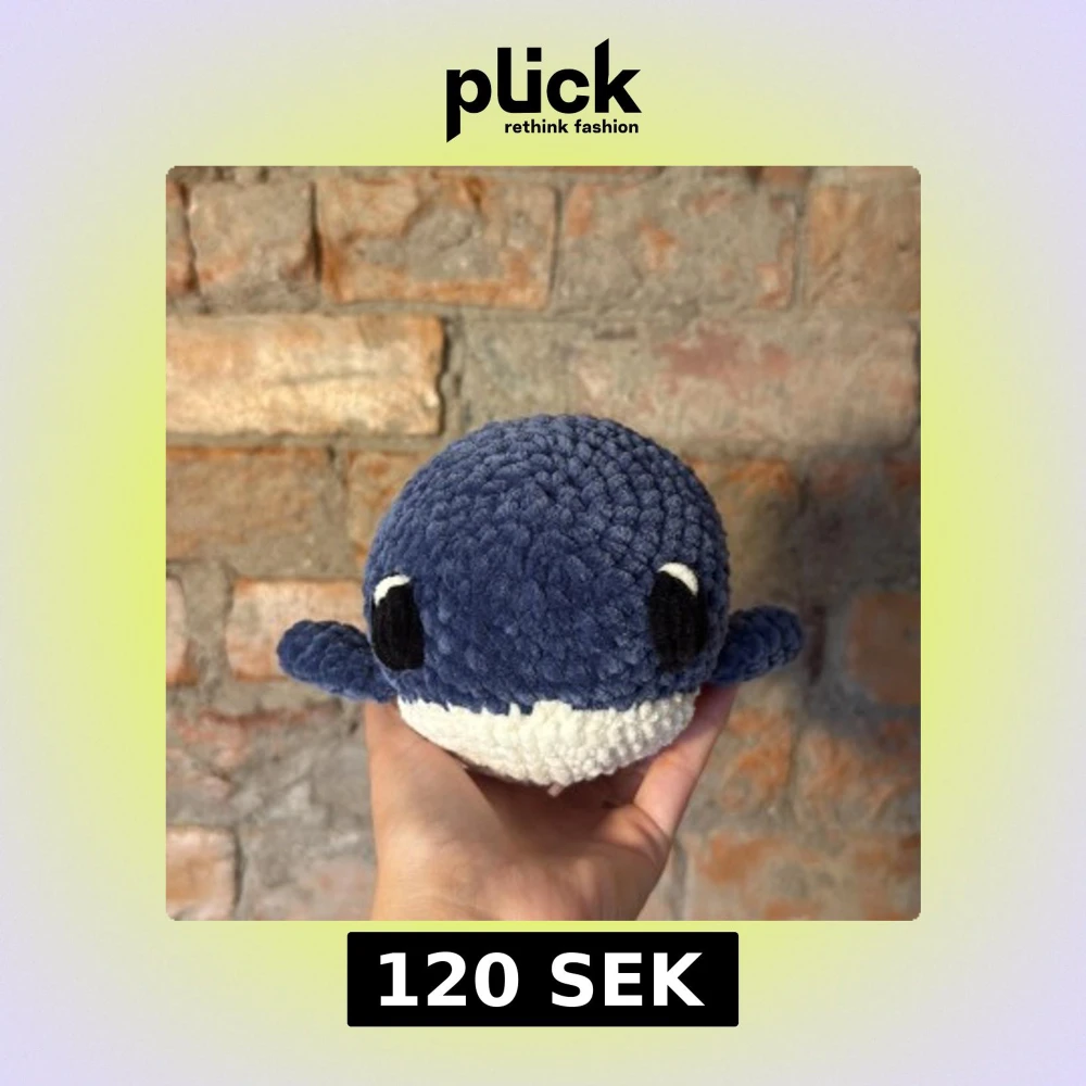 Virkar gosedjur i form av en val gjord i mjukt oeko-tex certifierat garn. Gjort av mig i hemmiljö där både hund och katt förekommer.