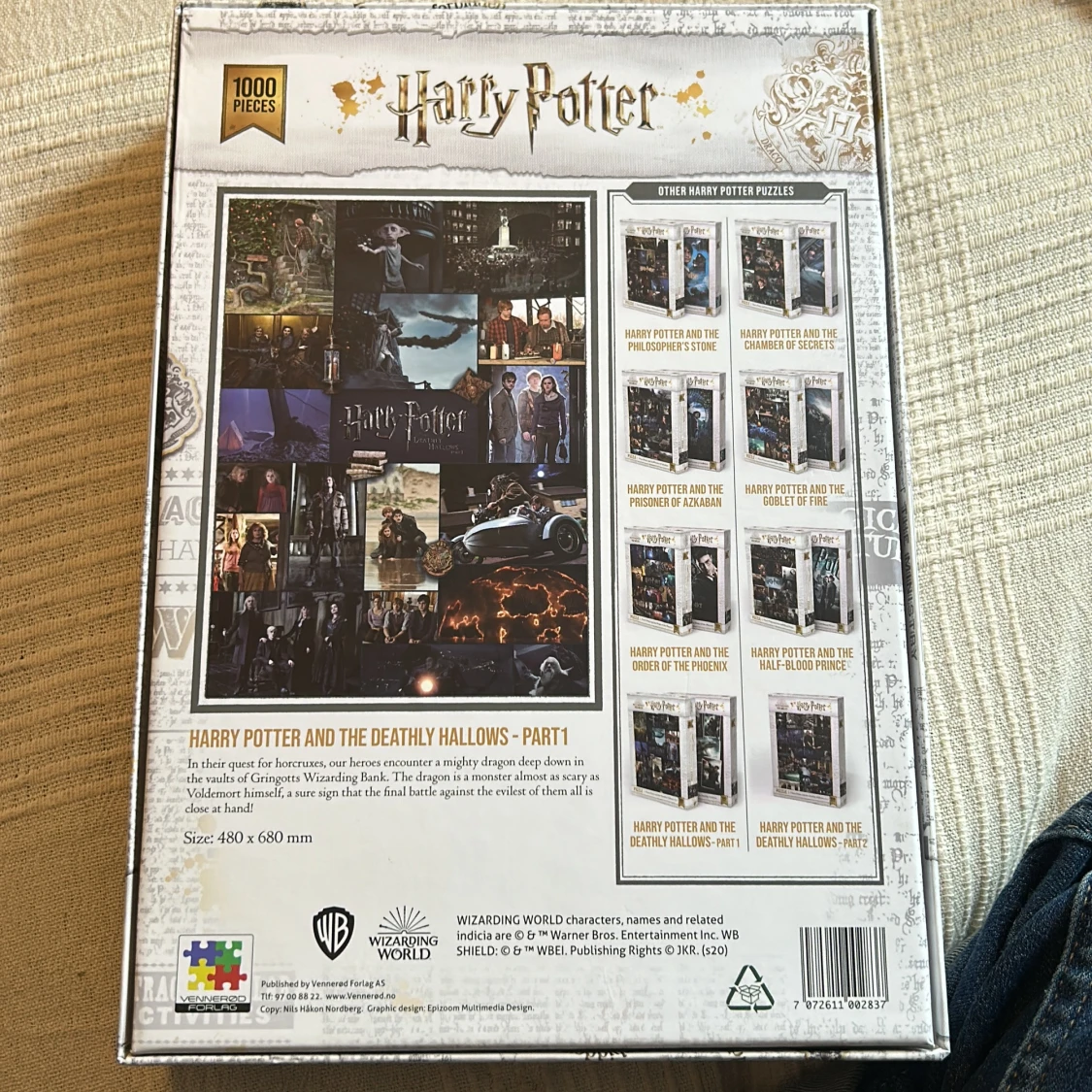 Pussel med 1000 bitar med motiv från filmen Harry Potter and the Deathly Hallows - Part 1. Flera ikoniska scener och karaktärer från filmen syns på motivet. Perfekt för Harry Potter-fans som gillar utmanande pussel. Tror att alla bitar finns i.😊