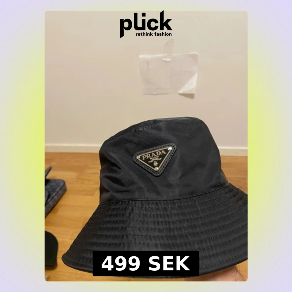 Säljer en stilren svart bucket hat från med klassisk trekantig logga framtill. Hatten har en mjuk och rundad form med bred kant och är tillverkad i ett syntetmaterial som ger en lätt glansig finish. Perfekt accessoar för att lyfta din look.