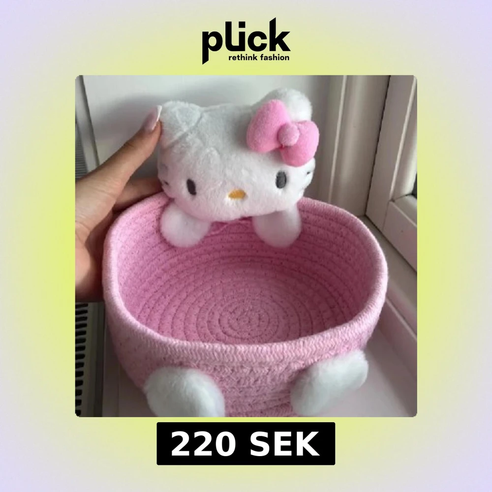 Supergullig korg i rosa med Hello Kitty-detalj upptill och mjuka vita tassar. Väskan har en stickad struktur och en söt rosa rosett på Hello Kittys huvud. Perfekt för dig som älskar kawaii och vill ha något unikt.