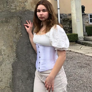 En vit korsett med storlek medium. Den är lite för stor för mig, men perfekt till den som vill ha den antingen under eller ovanpå ens kläder.