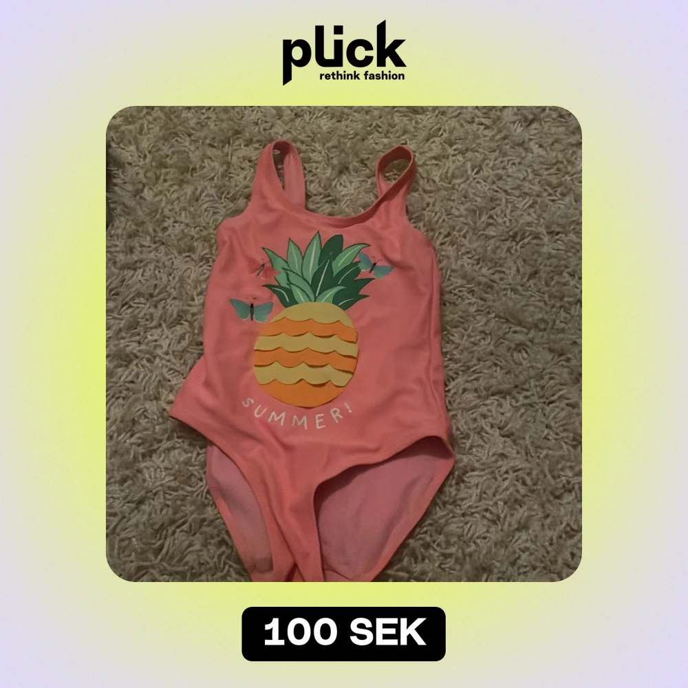 Söt rosa baddräkt från H&M med ett färgglatt ananastryck och texten 'SUMMER!' på framsidan. Perfekt för sommarens badäventyr! Passar barn i storlek 110/116, vilket motsvarar 4-6 år. Baddräkten har en enkel design med axelband och är gjord i ett bekvämt material.
