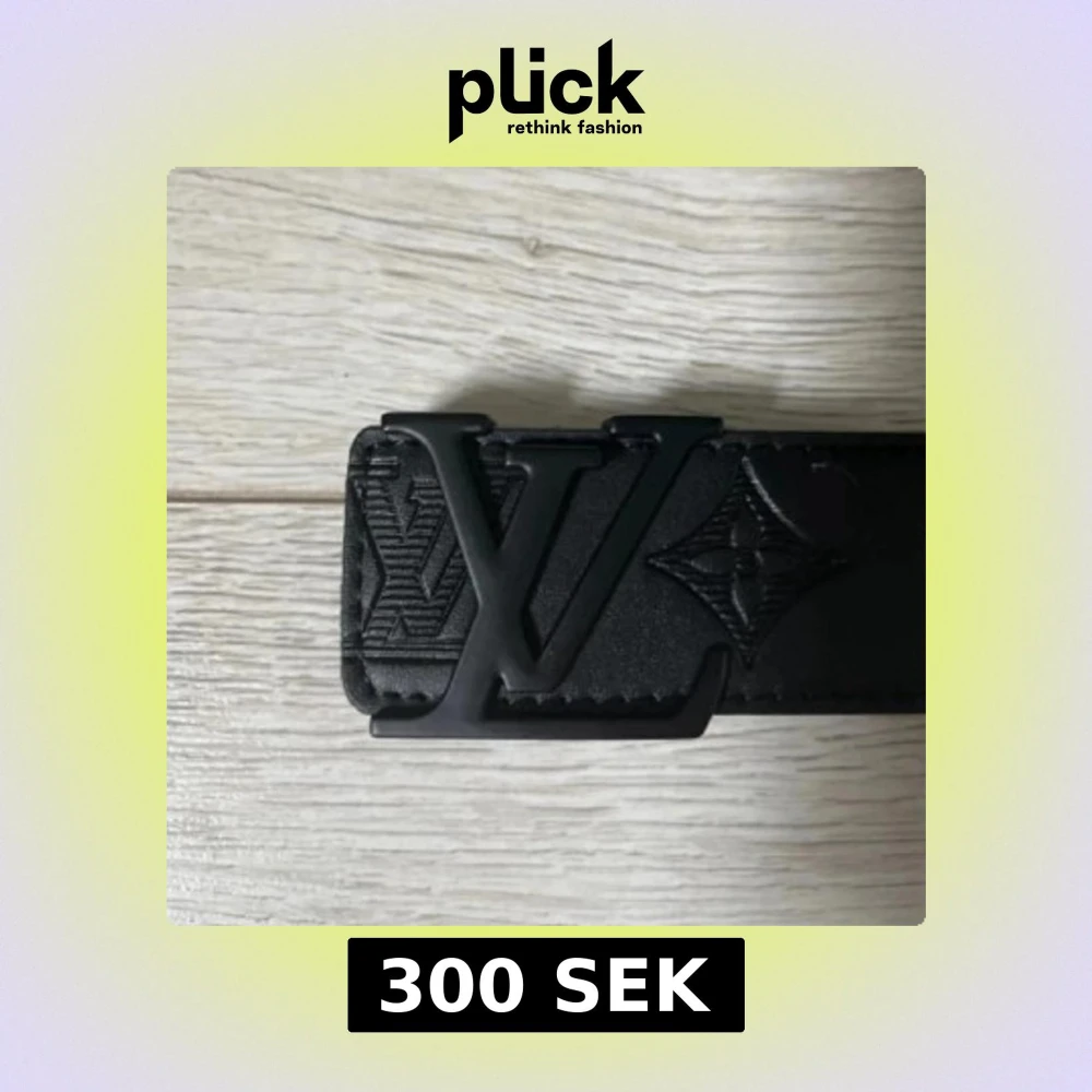 Säljer ett svart Lou** Vui**** bälte i skinn med präglade -loggor och monogramdetaljer längs hela remmen. Snygg, bred design med en stor -spänne i svart metall. Perfekt för dig som vill ha en lyxig och stilren accessoar med ikonisk känsla.