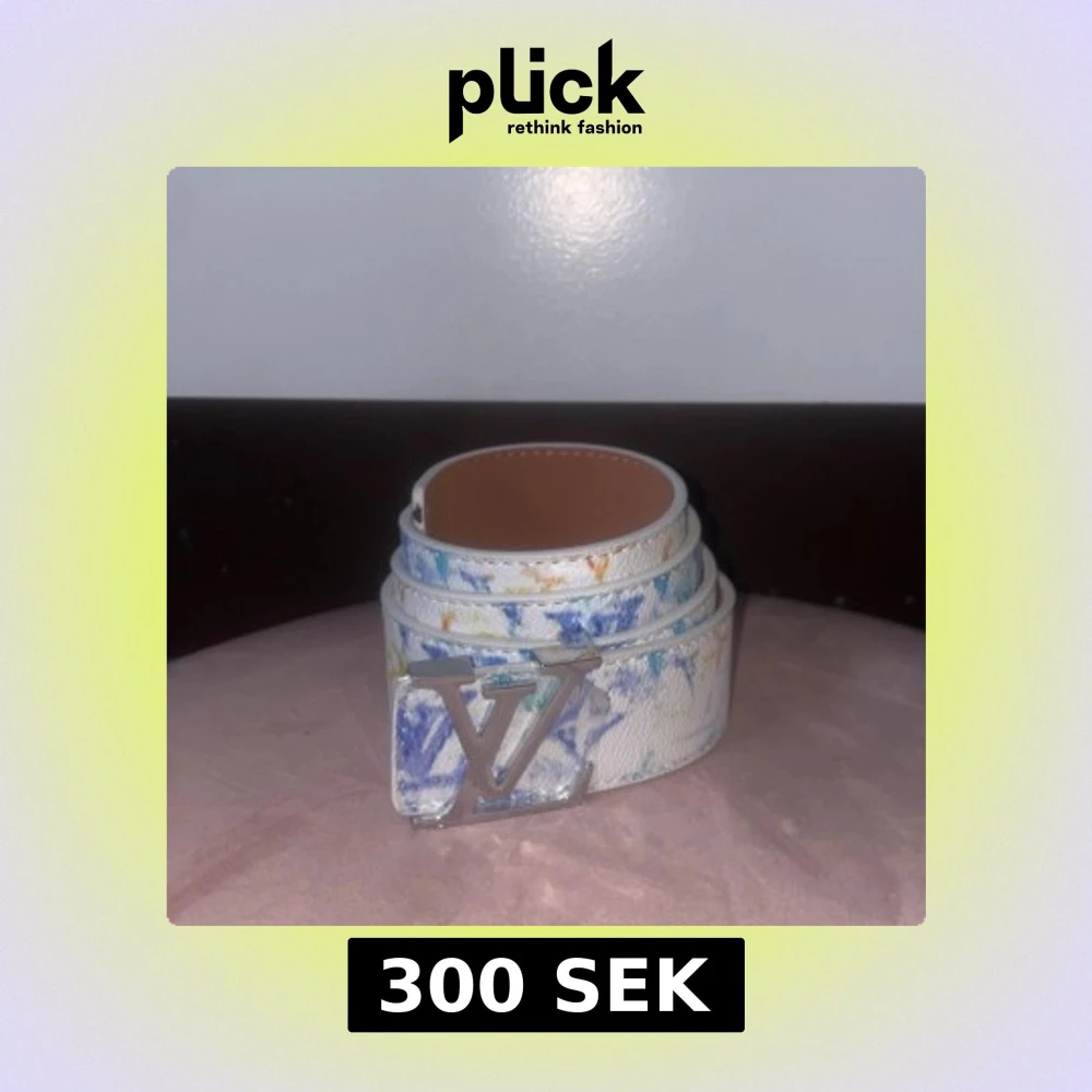 Snyggt vitt bälte med färgstänk i blått, gult och orange. Bältet har en stor logga i silver som spänne och är gjort i skinn. Perfekt accessoar för att lyfta din outfit med en unik touch.
