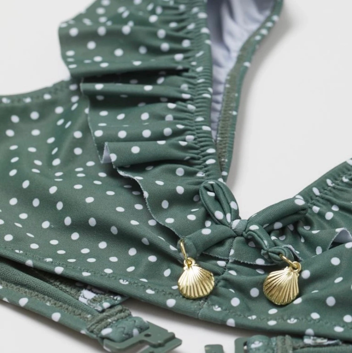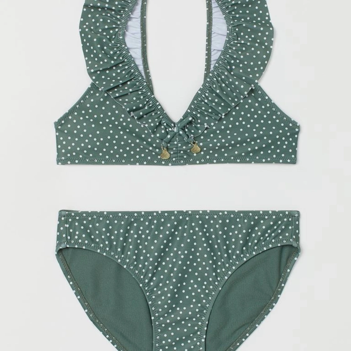 En jätte fin vit prickig grön bikini som e lite förstor och som jag inte använder.