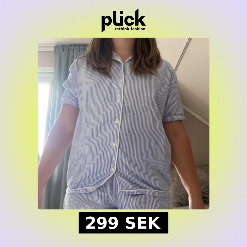 Säljer ett par blåvitrandiga pyjamasshorts med elastisk midja och vita kantdetaljer. Shortsen är i mjuk bomull och har en klassisk, avslappnad passform. Perfekta för sommarkvällar eller mysiga morgnar hemma.