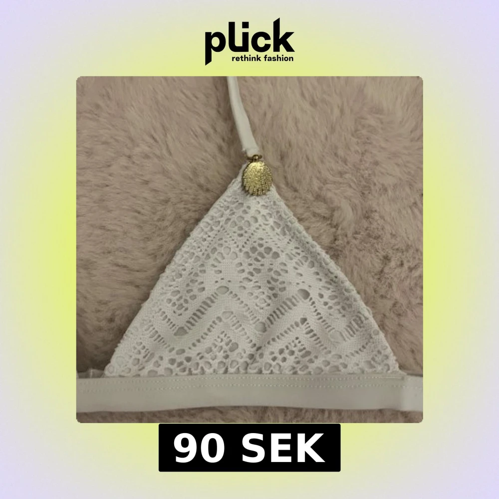 Superfin vit bikini med triangeltopp och matchande trosa, båda i virkad spets med zigzag-mönster. Toppen har en guldig snäckdetalj vid axelbandet och stängs med spänne i ryggen. Aldrig använd och säljer eftersom den är för liten!