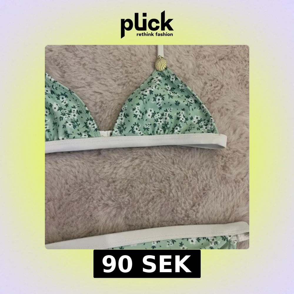 Superfin mintgrön bikini med vita blommor och mörkgröna blad. Triangeltopp med smala axelband och en söt guldfärgad snäckdetalj. Vita kanter runt både topp och trosa. Aldrig använd och säljer eftersom att den är för liten!