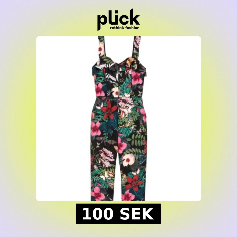 Snygg och färgglad jumpsuit med blommigt mönster i rosa, rött och grönt på en svart bakgrund. Den har breda axelband och volangdetaljer vid bysten. Perfekt för en somrig look!