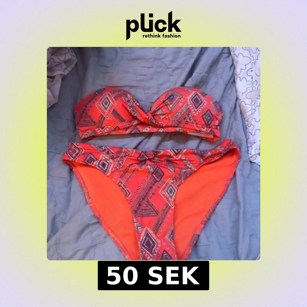 Snygg bandeau bikini orange med geometriskt mönster i blått och andra färger. Överdelen har twistad front och metallspänne bak, underdelen är klassisk med högre skärning. Perfekt för stranden eller poolen!