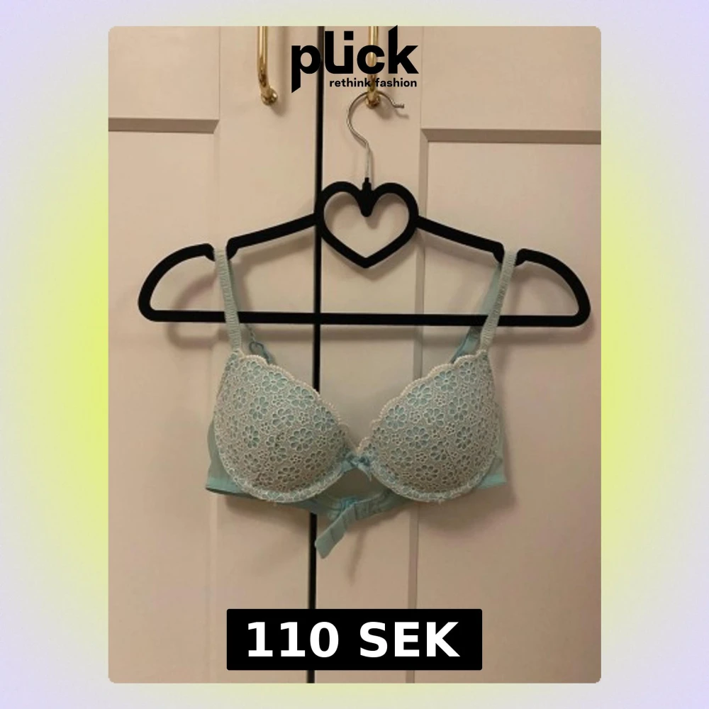 Snygg ljusblå bh från H&M med blommig spets på kuporna och justerbara axelband. Kuporna har ett tunt lager vaddering och spetsen är i polyester. Baksidan är slät och har hakknäppning. Perfekt för dig som gillar söta detaljer och pastellfärger.💕