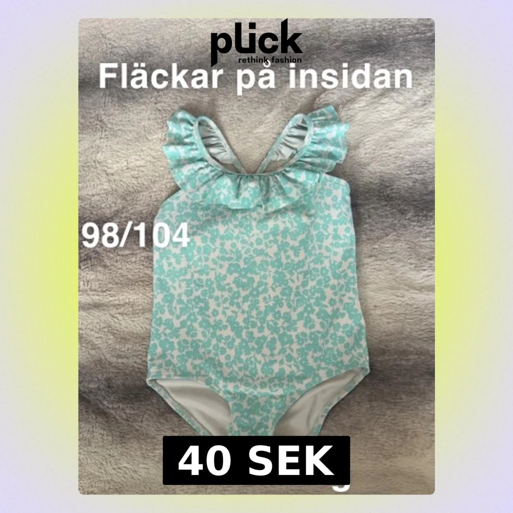 Söt baddräkt i vitt och turkost med blommigt mönster och bred volang runt axlarna. Perfekt för strand eller poolhäng. 🌸Någon liten fläck på insidan. Storlek 98/104
