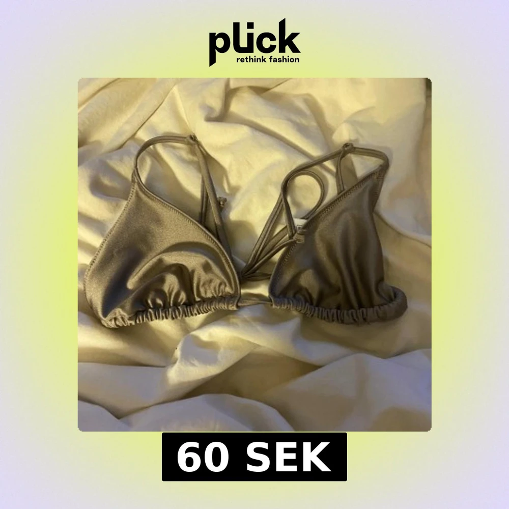 Säljer en stilren grå bikiniöverdel från H&M med trekantsformade kupor och smala axelband. Modellen har knyt i ryggen och under bysten för justerbar passform. Perfekt för strand eller poolhäng.