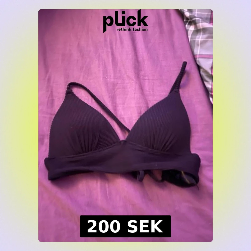 Säljer en svart bikiniöverdel från H&M i storlek 34. Den har ribbad struktur, smala axelband och en enkel, stilren design. Perfekt för dig som gillar minimalistisk stil på stranden eller vid poolen.