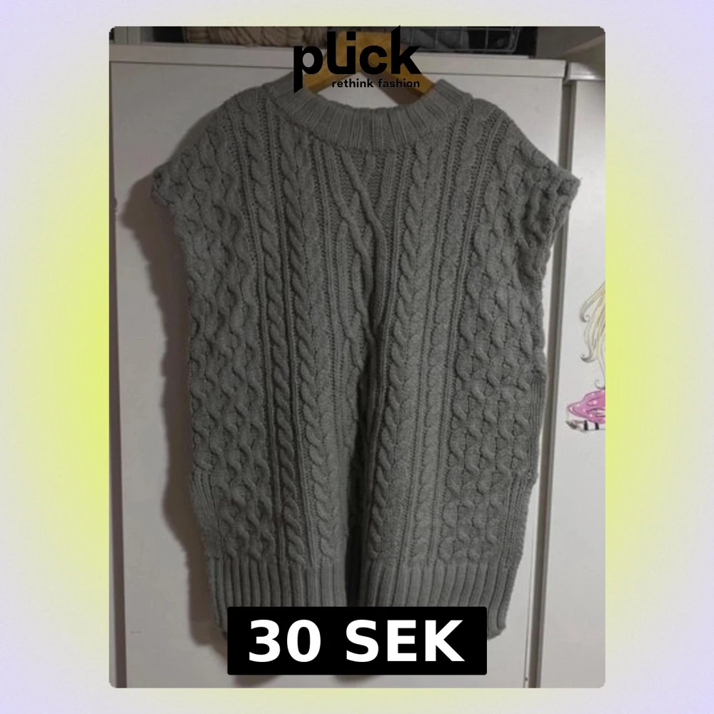 Säljer en grå stickad väst med grovt flätmönster och bred ribbad kant nedtill och vid halsen. Västen är ärmlös och har en loose passform, perfekt att slänga över en skjorta eller långärmad tröja. Det finns en brun penn fläck som kan ses på bilden.