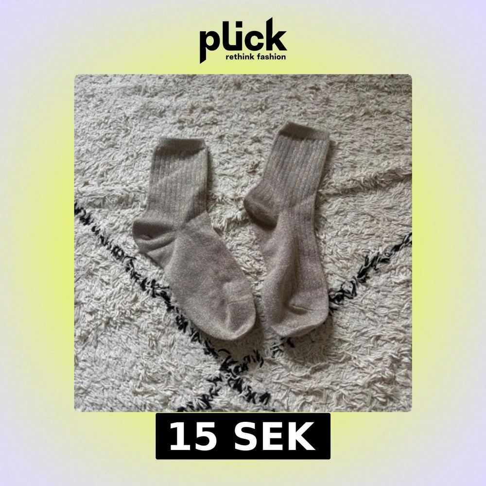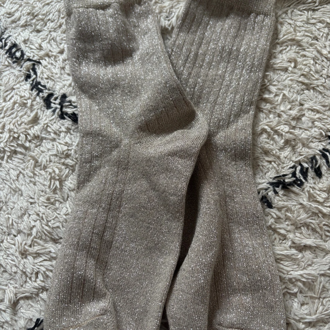 Säljer ett par snygga ribbade strumpor i Silver med glittrig finish. Perfekta för att ge outfiten lite extra bling! Strumporna är mellanhöga och har en mjuk och stretchig känsla.