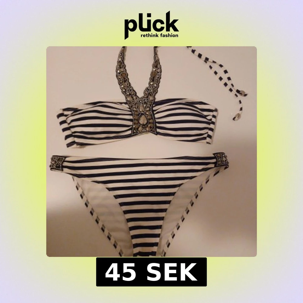 Snygg bikini från H&M med marinblå och vita ränder. Överdelen har halterneck med smyckesdetaljer och knyt i nacken, samt dekorativa pärlor framtill. Underdelen har matchande pärldetaljer på sidorna. Perfekt för stranden eller poolen! Änvända 1 gång nyskick.