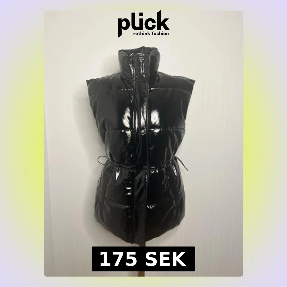 Svart dunväst från H&M i storlek S med glansig finish och hög krage. Västen har dragkedja och tryckknappar framtill, två fickor och snörning i midjan för att justera passformen. Perfekt för att ge din outfit en cool edge.