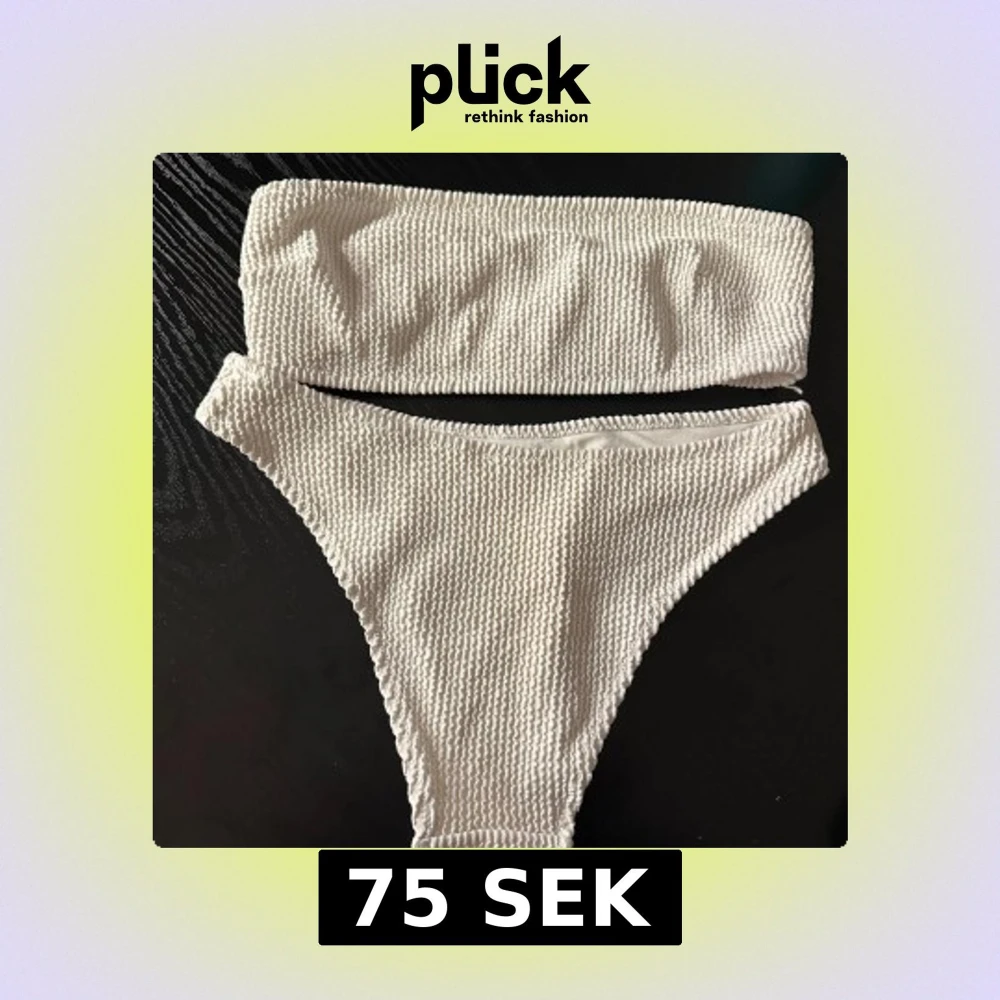 Snygg vit bikini med ribbad textur. Bandeau-topp och matchande trosa i en stilren design. Storlek s/m båda delarna