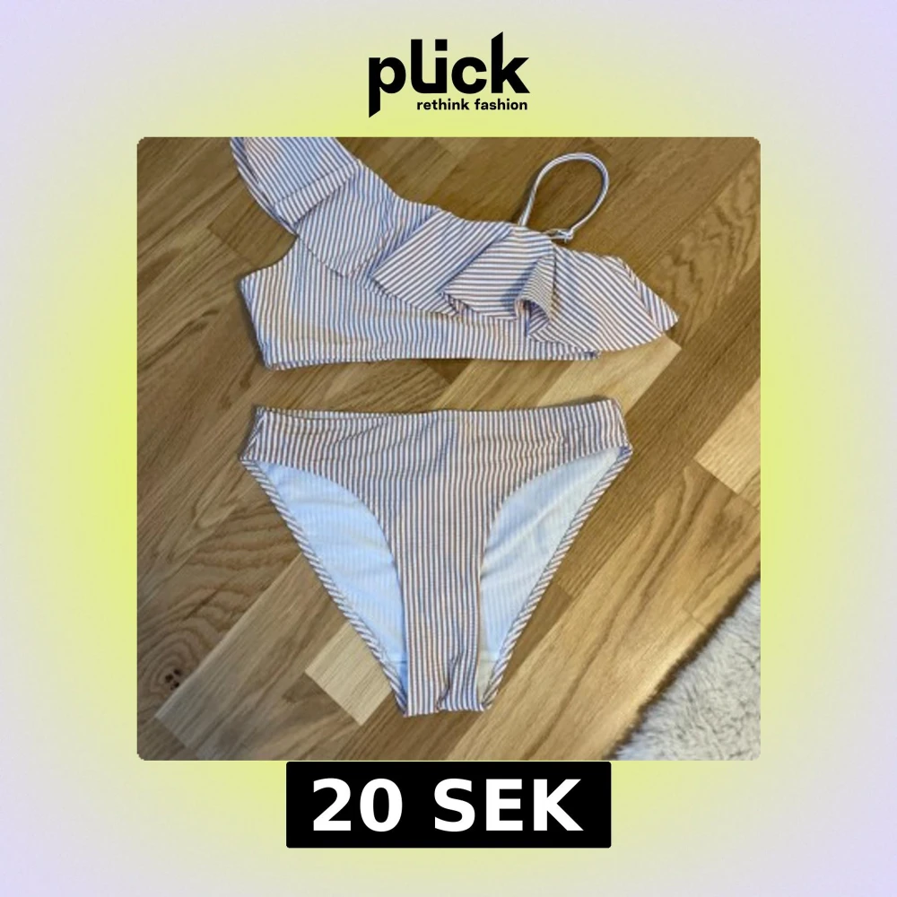 Superfin bikini med smala beige och vita ränder. Toppen har en axel och volangdetalj som ger en trendig look. Bikinin är fodrad och har en klassisk bikiniunderdel. Perfekt för stranden eller poolen!