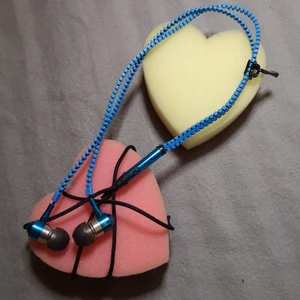 Blå hörlurar. Sladden är dragkedja och kan justeras jätte enkelt. Använda max 5 gånger. Kvalitén är skaplig eftersom kablarna går genom dragkedjan, justerar du det medans du lyssnar kommer du höra det. Men dom är bra och roliga att använda.