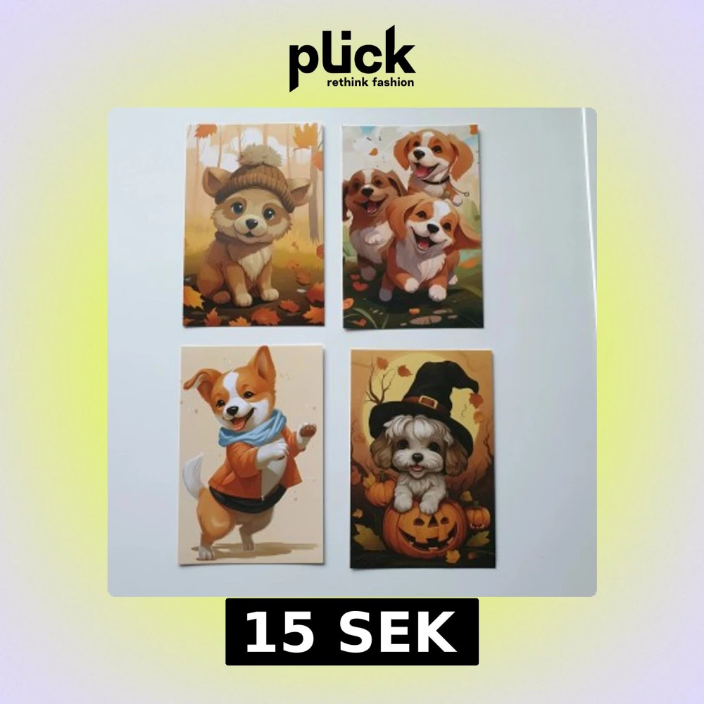 Upptäck fyra charmiga illustrationer av hundar i höstmiljö! Varje bild visar en gullig hund i olika outfits och stämningar, från en stickad mössa till halloween-hatt. Perfekt för dig som älskar djur och vill ha något färgglatt och mysigt i bokhyllan.