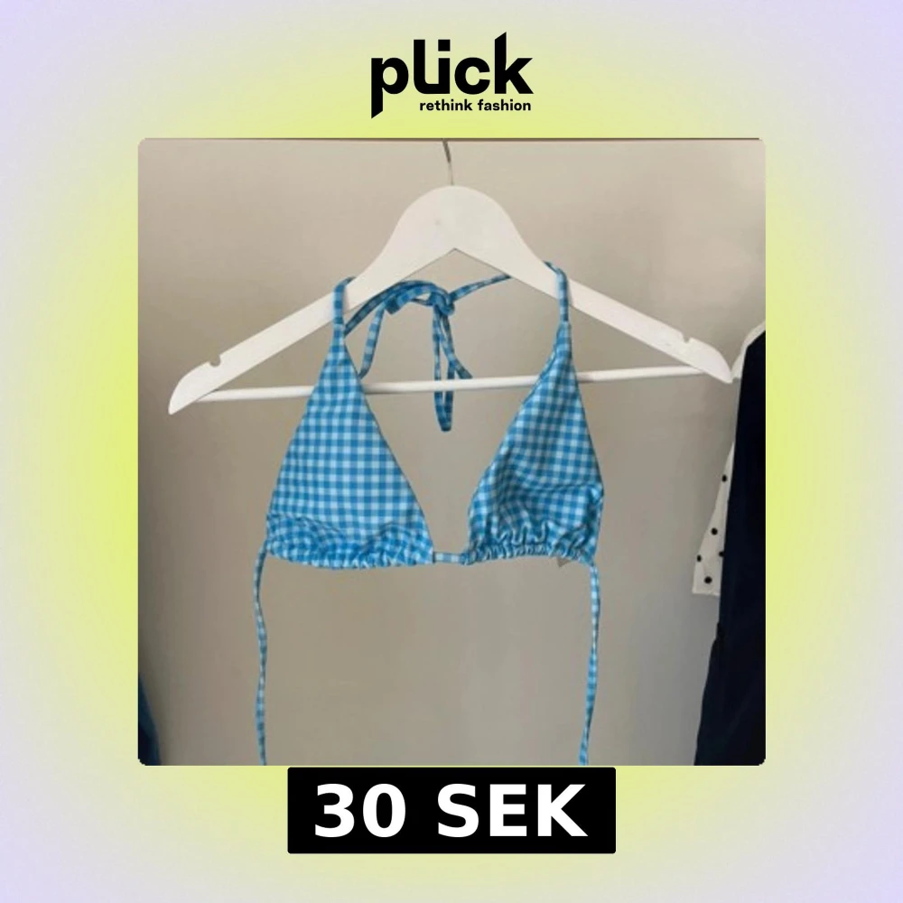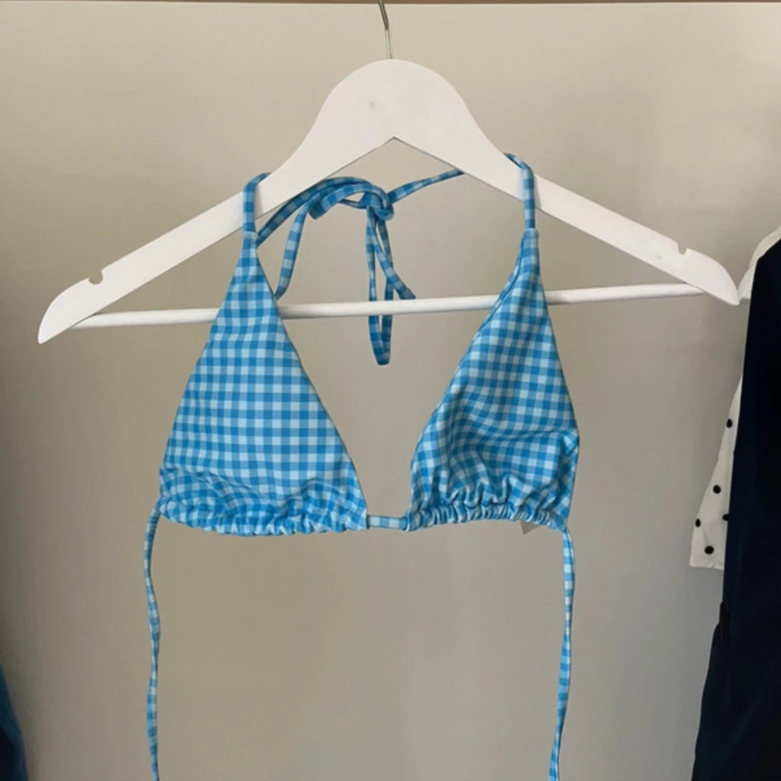 Säljer en superfin bikini i blått och vitt med rutigt mönster. Toppen har trekantsform och knyts i nacken och ryggen, medan underdelen har scrunch-detaljer på sidorna. Materialet är mjukt och stretchigt, perfekt för strandhäng eller poolparty.