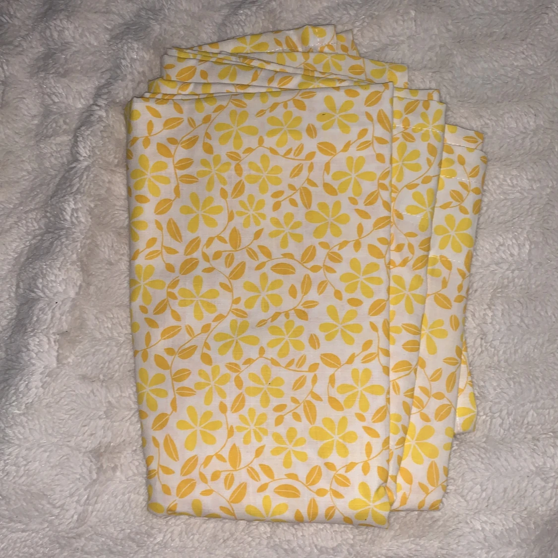 Gardin med gul/orange tryck. Hängs up genom att träda gardinstång genom. Dvs inga öglor. Finns 4st. Från Ikea. Använda ca 1 vecka.