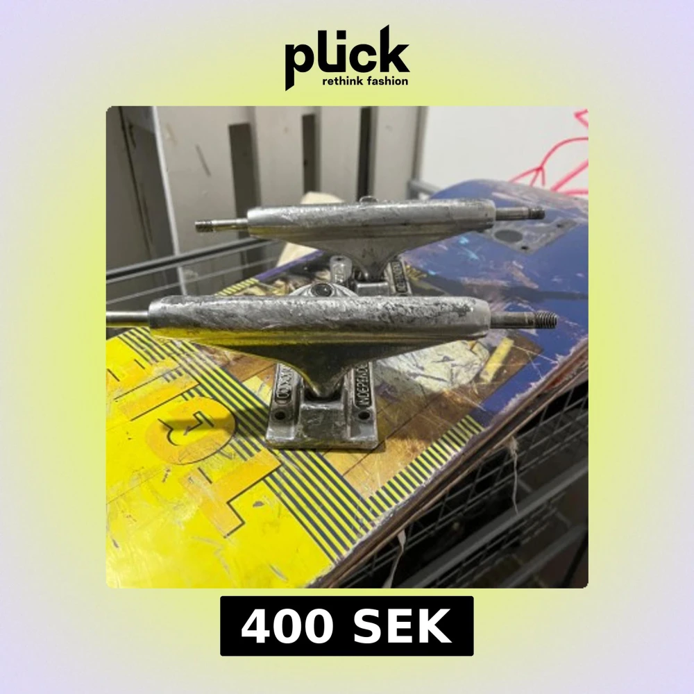 Bilden visar skateboard-truckar. Truckarna är av märket Independent och har tydliga tecken på användning med repor och slitage, men ser fortfarande robusta ut.