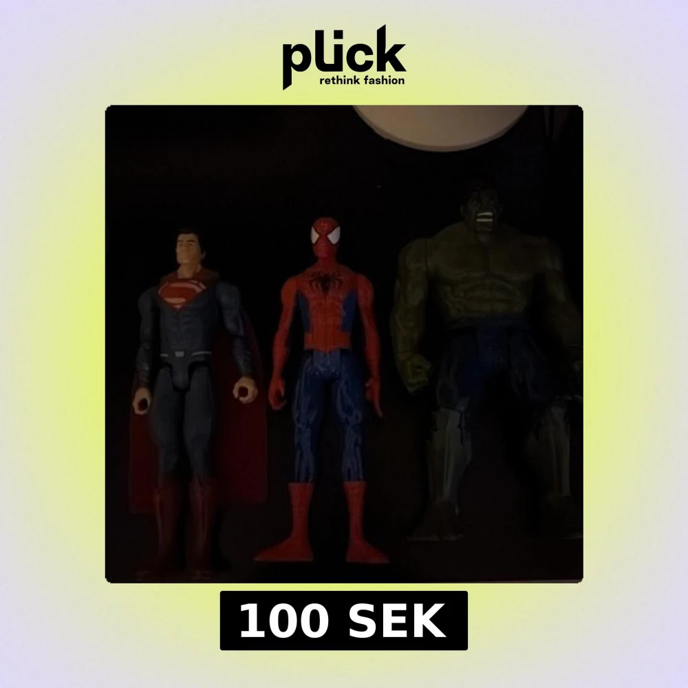 Tre actionfigurer: Superman, Spiderman och Hulk. Figurerna är i gott skick med mindre spår av användning. Perfekt för samlare eller barn som älskar superhjältar. Inga synliga större defekter, färgerna är klara och detaljerna tydliga.