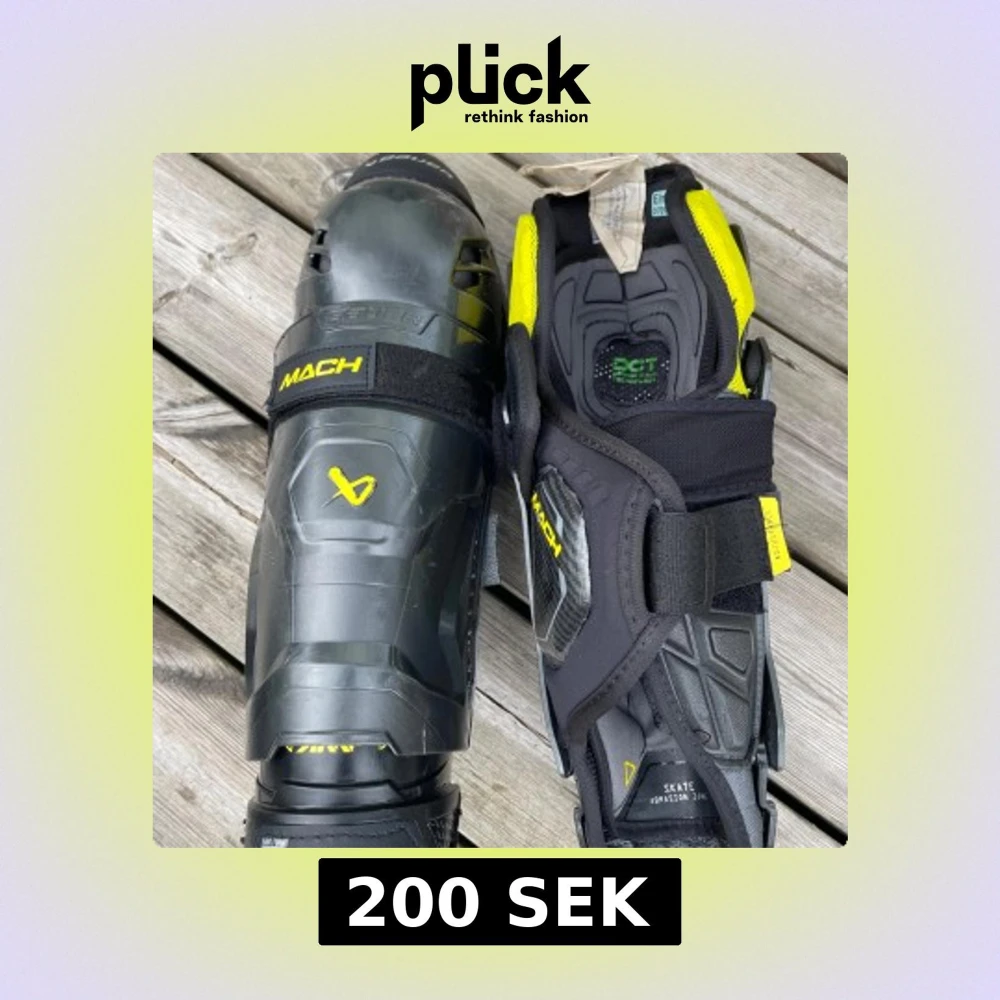 Säljer ett par Bauer Mach hockeyskydd i svart och gul design. De har robusta skyddszoner, justerbara kardborreband och ventilerande meshdetaljer. Perfekta för dig som vill ha grymt skydd och cool look på isen.