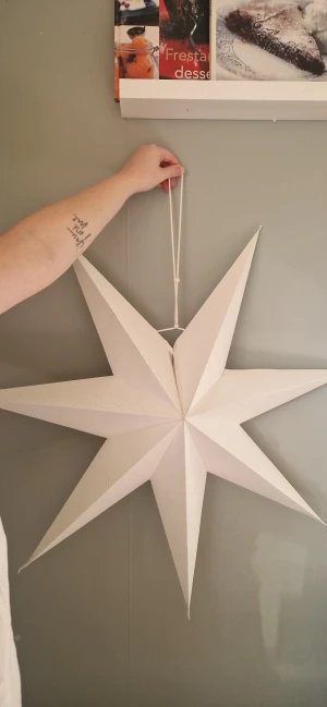 Stor vit adventsstjärna med dekorativt perforerat mönster. Hängs upp med medföljande snöre. Stjärnan är i gott skick, mindre veck och slitage kan förekomma- går att användas ändå och inget som syns super tydligt. Snygg och stilren design.