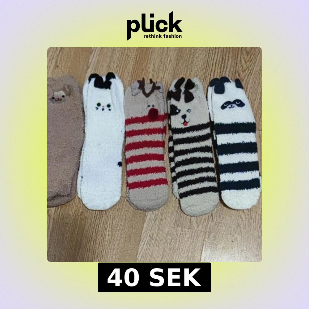 Fem par supermjuka och fluffiga strumpor med söta djurmotiv. Färgerna är beige, vit, röd, svart och grå, och flera har randigt mönster. Strumporna har detaljer som öron och ansikten på skaftet, perfekt för att mysa hemma under vintern. Obs Jag har mer om man vill ha.