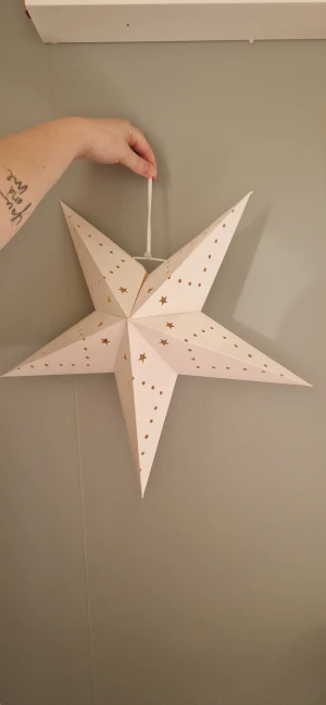 Stilren vit lite mindre pappersstjärna med stansade stjärnor och prickar. Hängs upp med medföljande snöre. En liten fläck syns på en spets- ej provat få bort annars i gott skick.