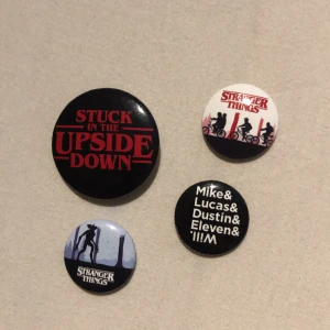 Gulliga knappar/pins/badges med stranger things tema (: Skickas med brev och frakten kostar 15 kronor. En pin för 10 kr eller alla för 15+15 kronors frakt ❤️Perfekt att sätta på väskan, i bra skick! Kontakta innan köp 🫶