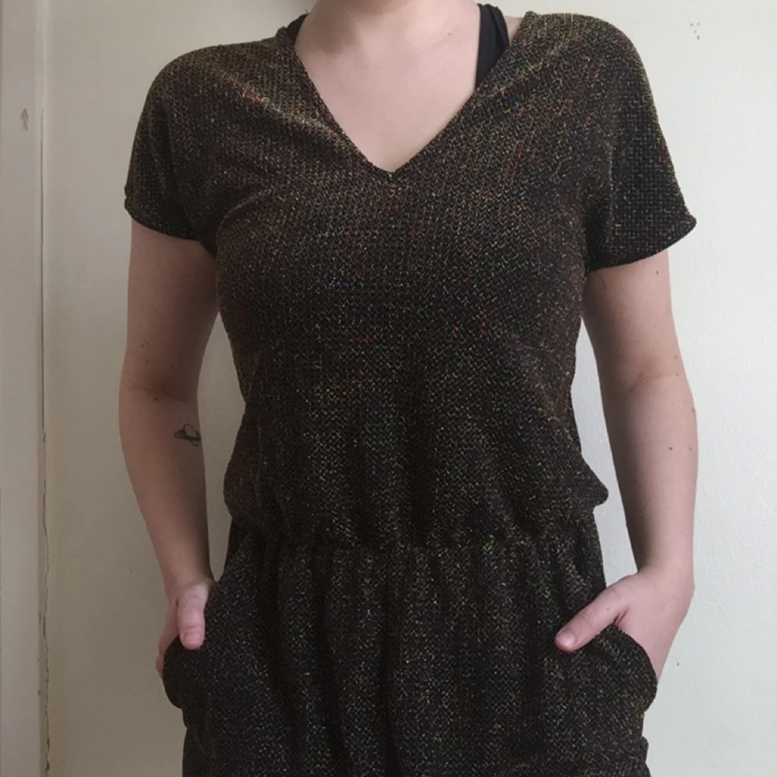 V-ringad jumpsuit i guld och svart jersey. Oerhört bekväm, dock aldrig använd! Har fickor fram, avsmalnade ben och knäpps med en knapp i ryggen. Jag är 165 cm lång och på mig är benen pösiga, men inte för långa och midjan sitter strax ovanför naveln.