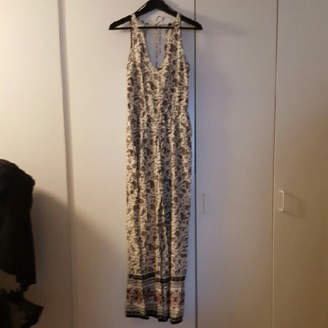 Lång jumpsuit i snyggt mönster. Öppning i ryggen med knytband. Möts gärna i Gbg, annars tillkommer fraktkostnad för köparen.