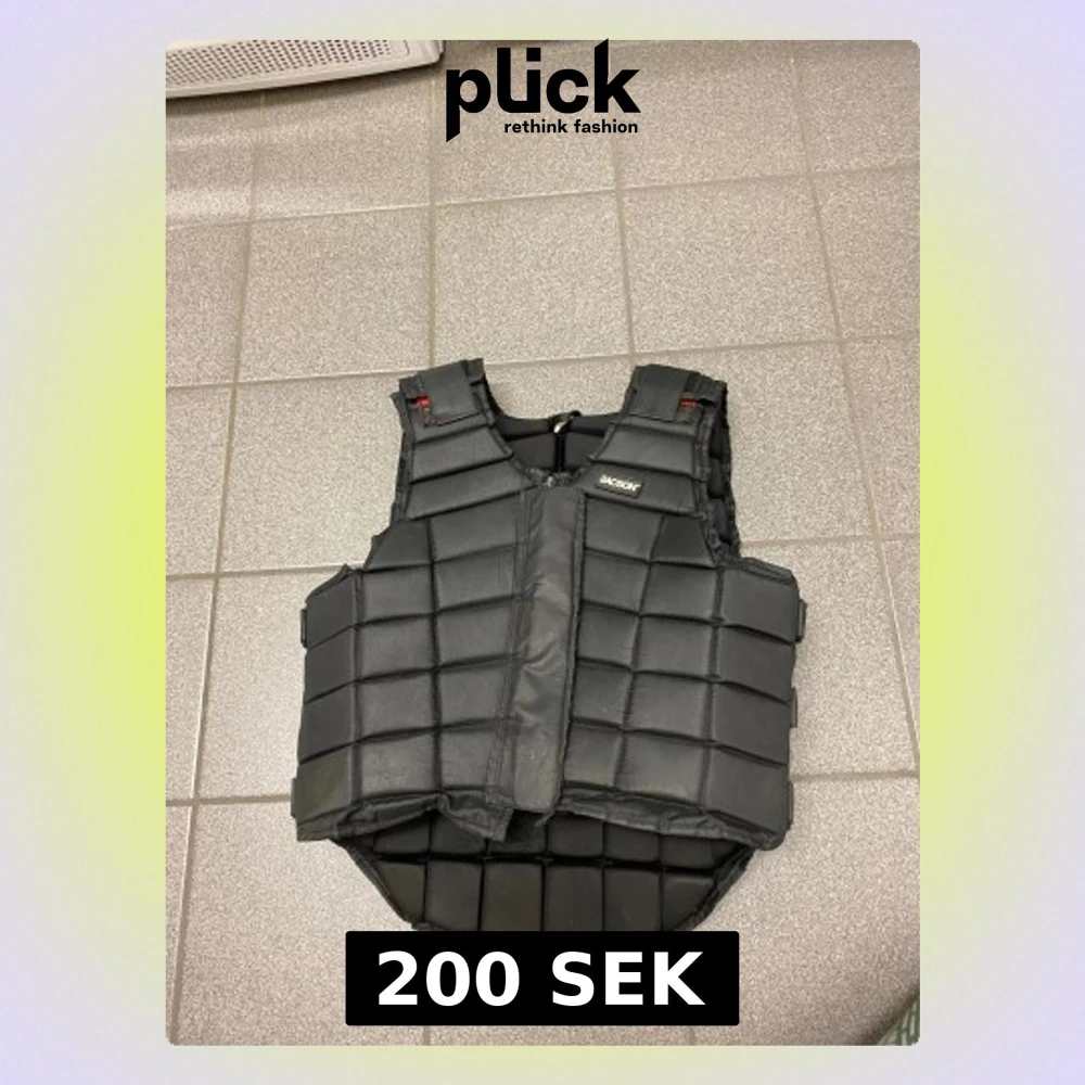 Säljer en svart säkerhetsväst från ridsport med quiltad design och justerbara remmar på sidorna som man kan justera. Västen har dragkedja framtill och är tillverkad i slitstark syntet med vadderade paneler för extra skydd. Perfekt för dig som vill ha trygghet vid ridning.