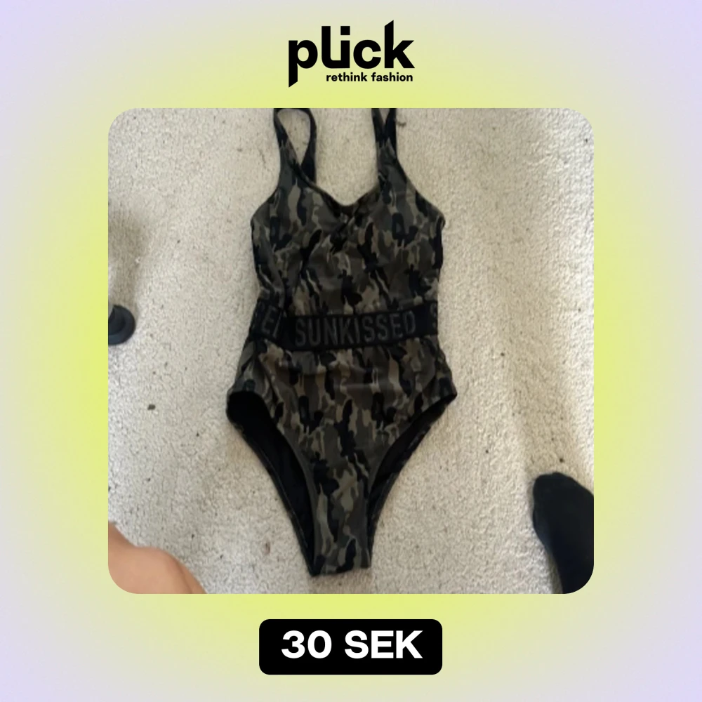 Säljer en supercool kamouflagemönstrad baddräkt från Sunkissed. Den har texten 'Sunkissed' tryckt flera gånger på banden och en snygg öppen rygg. Perfekt för sommarens bad och strandhäng! Baddräkten är i nyskick och har en tight passform.