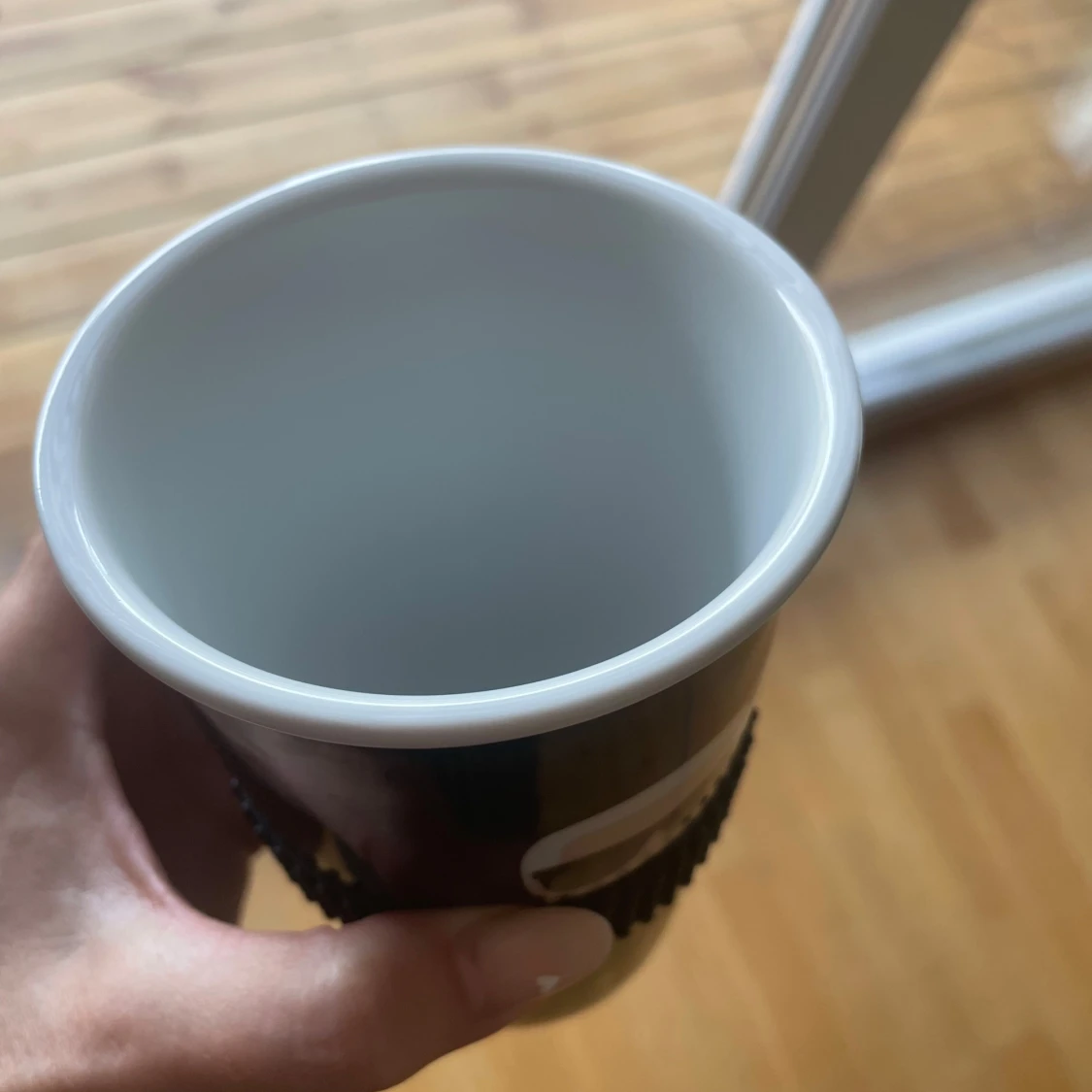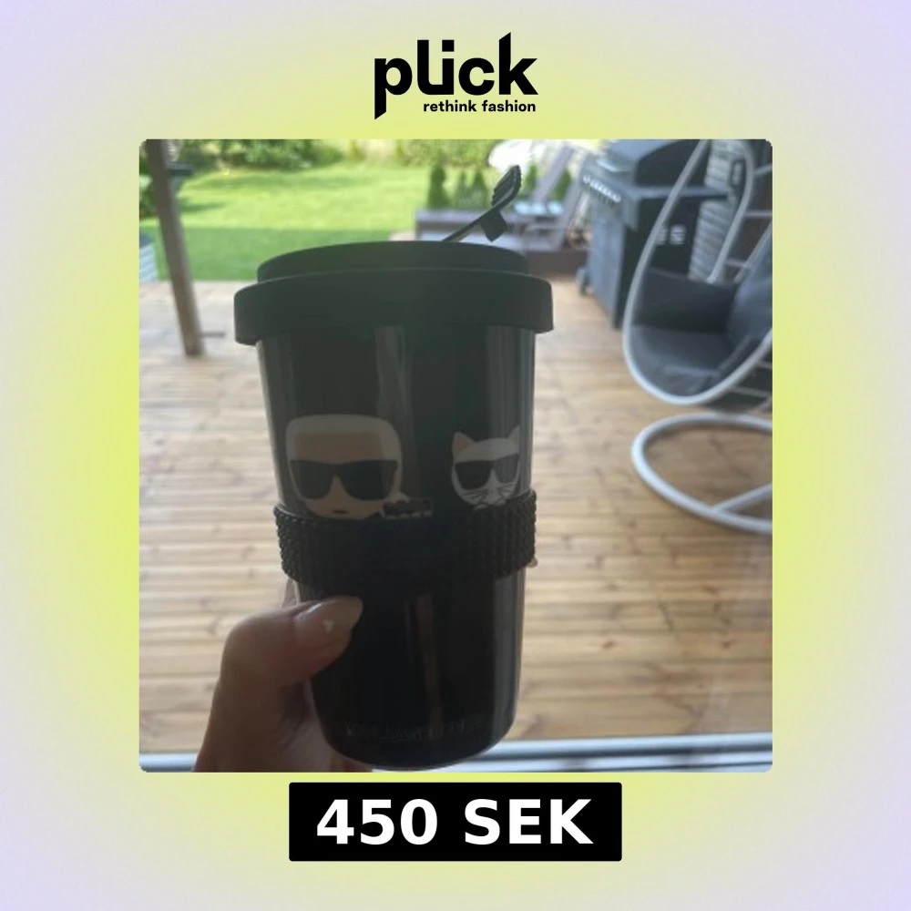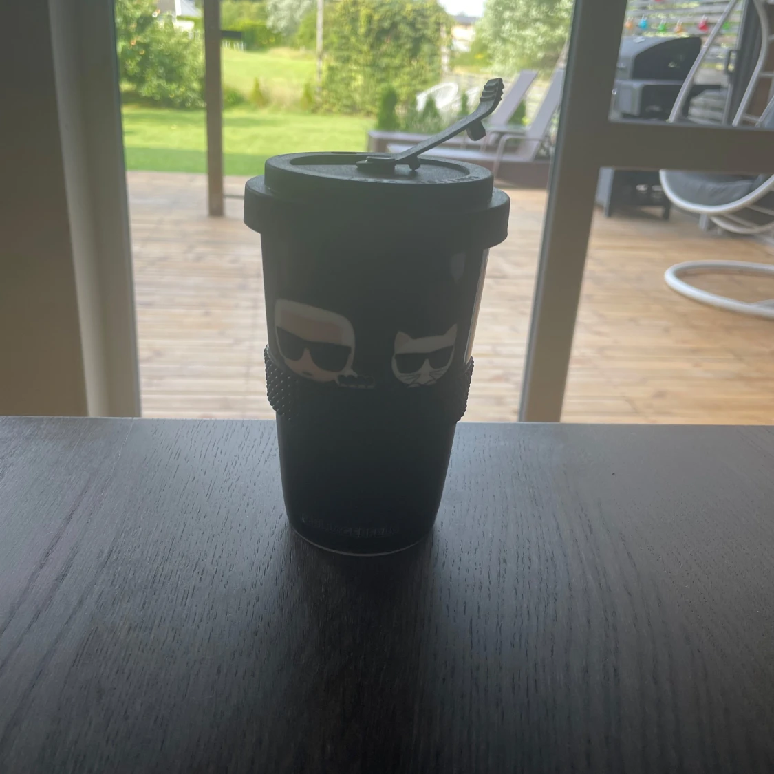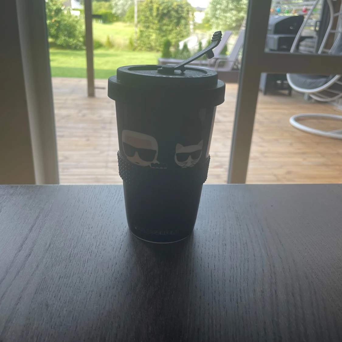 en svart take-away mugg med illustrationer av en person med solglasögon och en katt med solglasögon. Muggen har en gummiring för grepp och är märkt med 'Karl Lagerfeld'.