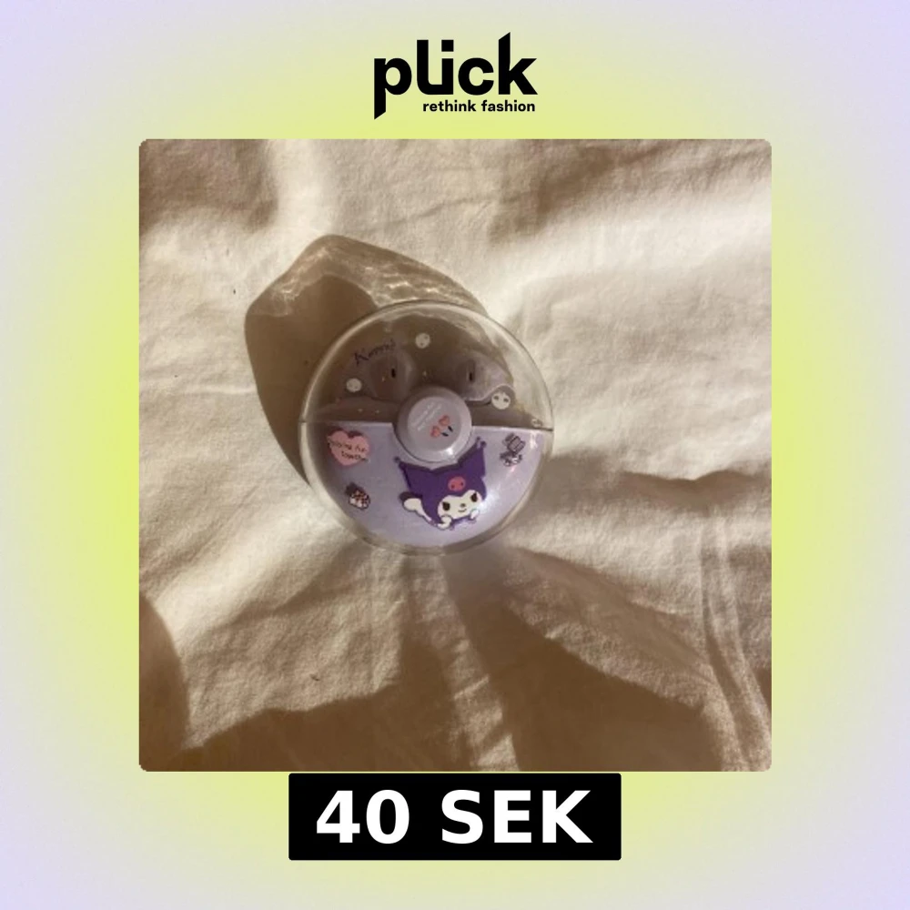 Säljer ett par trådlösa hörlurar i ett lila fodral med en söt Kuromi-design. Fodralet är runt och har en USB-C port för laddning. Perfekt för den som älskar kawaii-stil och vill ha något unikt till sin musikupplevelse. Från minozo