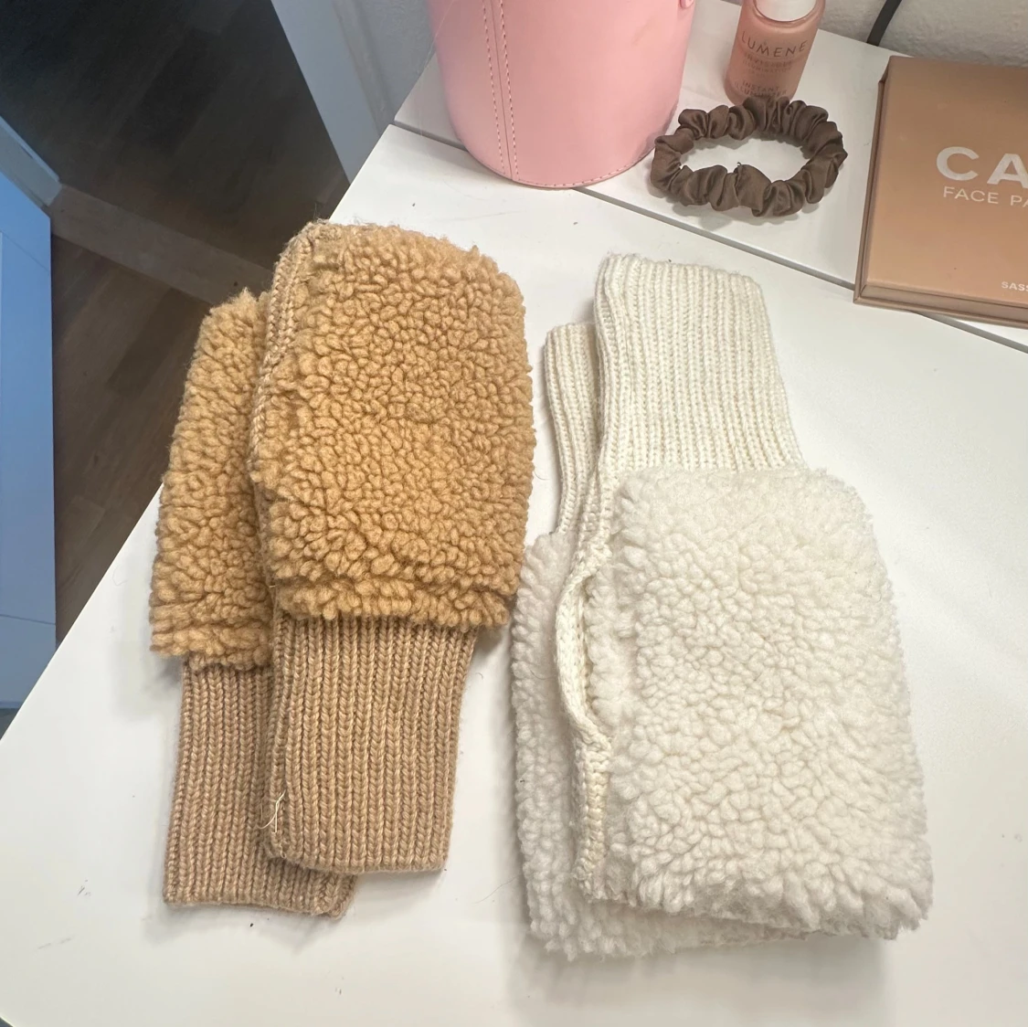 Stickade vantar i beige och vit