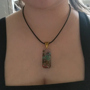 Ett halsband med kristaller och en guldig ståltråd (den ser silvrig ut på andra bilden) i smycket. Går att ställa in längden i nacken, bild 1 visar hur lång den är när den är inställd på det kortaste.